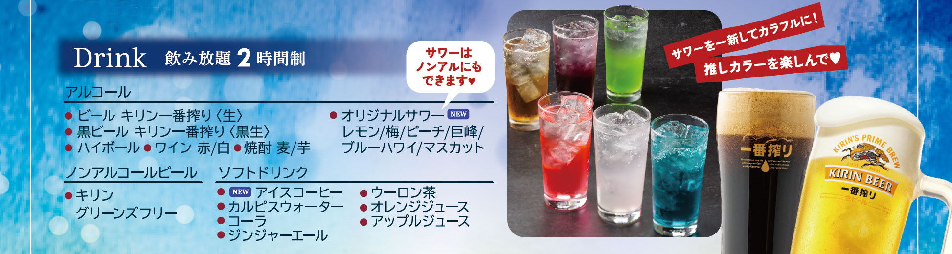 生ビール(キリン一番搾り・黒生)・ハイボール・各種サワー・一部ノンアルコールドリンクはセルフシステムです。その他のドリンクをご希望の方は、ドリンクカウンターにお声掛けください。